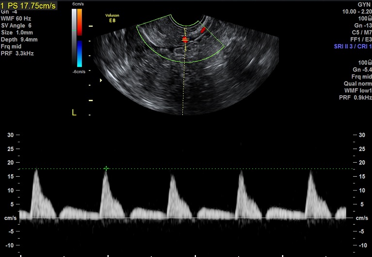 R: PSV:33.7cm/s EDV:2.6cm/s RI:0.92 S/D:13.5 PI:3.95,舒张早期血流反向