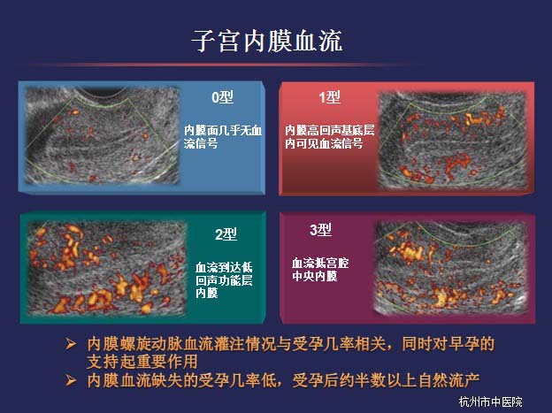 内膜和内膜下血流:应用阴道彩色多普勒测定内膜-内膜下血流分布是评价子宫内膜容受性简单而有效的方法。与内膜和内膜下无血流组相比,当内膜和内膜下均检测到血流,妊娠率和种植率最高,内膜也最厚,流产率最低。