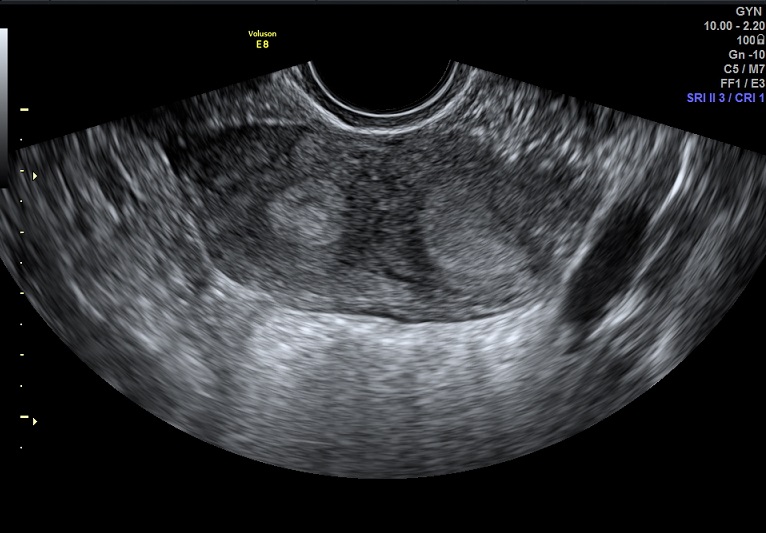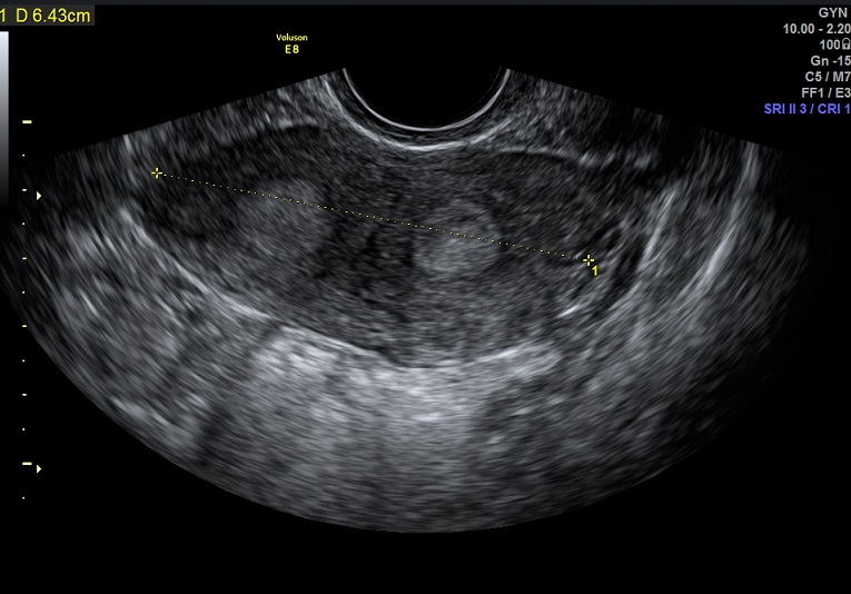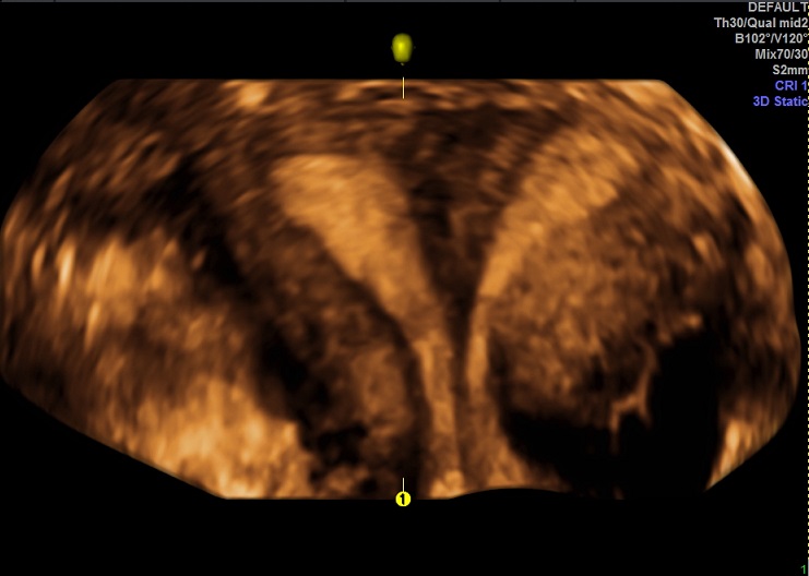 女性,25岁,原发性不孕2年,有子宫畸形病史,畸形类型不详。常规二维超声子宫横径增宽,宫底部横切面内膜不连续,动态扫查似显示为Y型。宫腔三维显示:两侧宫角分开成Y型,内膜凹陷达到宫颈内口。诊断:完全中隔子宫。