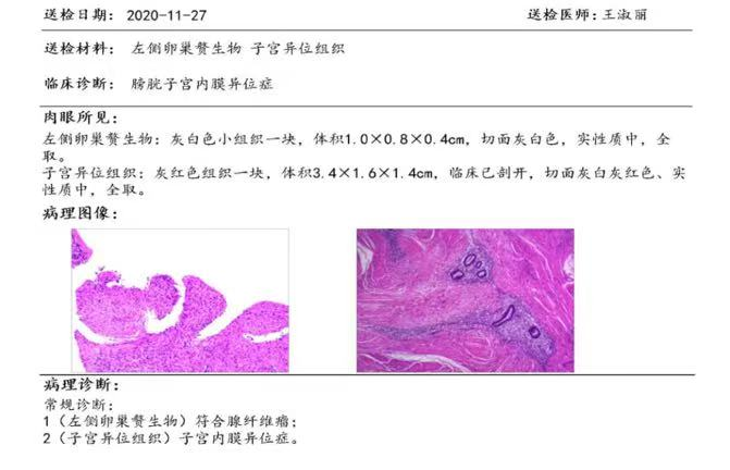 于2020年11月27日在全麻下行腹腔镜膀胱子宫内膜异位病灶切除术(备开腹),手术历时230分钟,出血约200ml。术中分离粘连、推离膀胱,完整切除病灶。术后留置尿管14天,引流管5天后拔除。