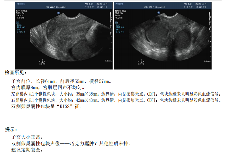 · 超声(2025-05-04):双侧卵巢囊性包块,左侧39mm×38mm,右侧42mm×43mm,呈“KISS”征。