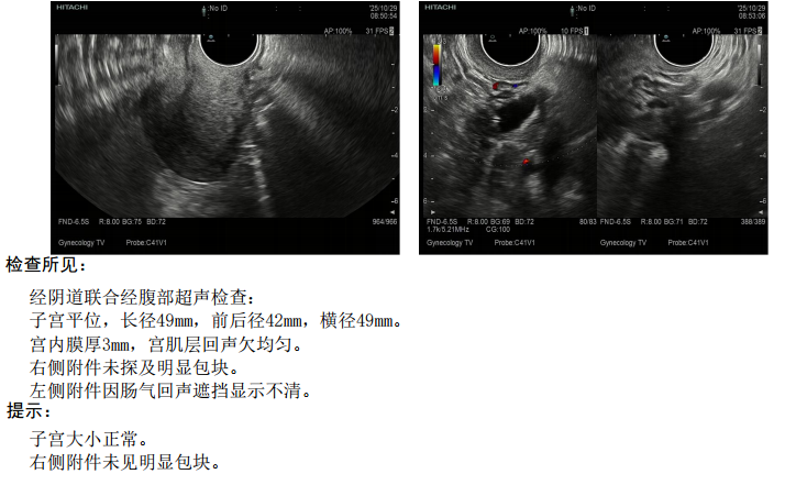 外阴发育正常,阴道畅,宫颈光滑,子宫前位、稍大,质韧,活动可,无压痛。双侧附件区均可触及囊性肿物,约4×4cm。