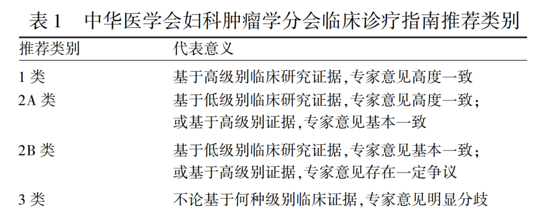 本指南采用中华医学会妇科肿瘤学分会临床诊疗指南推荐类别,见表1。