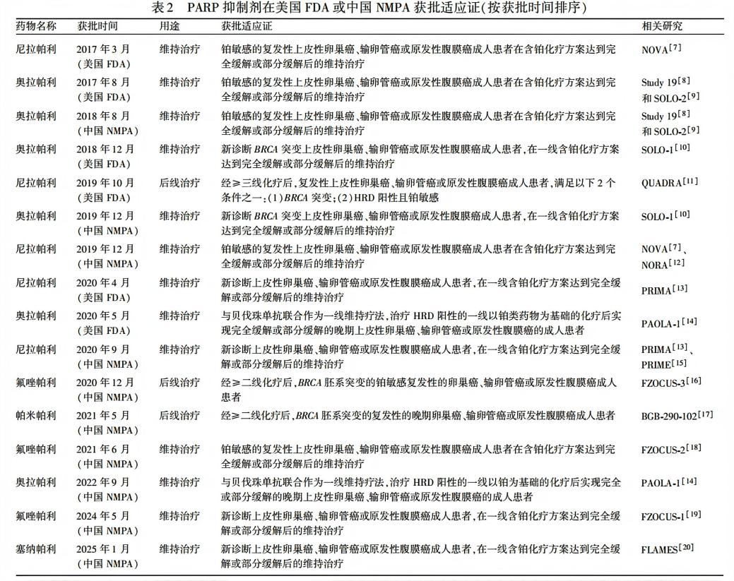 目前美国FDA批准4种PARP抑制剂、中国NMPA批准5种PARP抑制剂应用于临床,其适应证见表2。