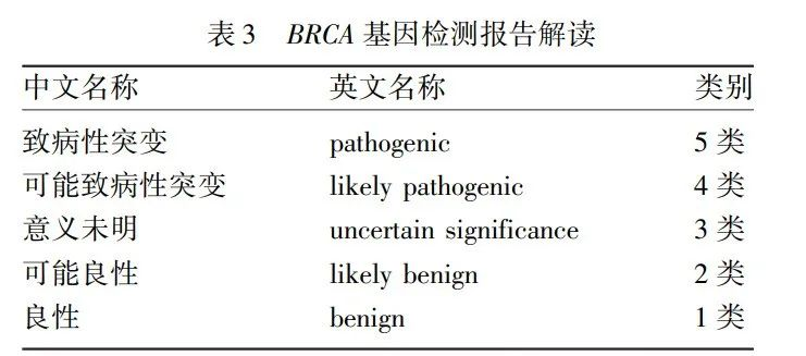 BRCA基因突变是首选的PARP抑制剂敏感生物标志物。BRCA基因突变包括胚系BRCA(gBRCA)突变和体细胞BRCA(sBRCA)突变,从肿瘤组织检测的BRCA突变用组织细胞BRCA(tBRCA)突变描述。国内外多采用二代测序(NGS)检测,突变类型包括点突变、小片段插入/缺失等。BRCA基因检测报告解读(胚系变异)依据国际癌症研究机构(IARC)分类标准(表3)。