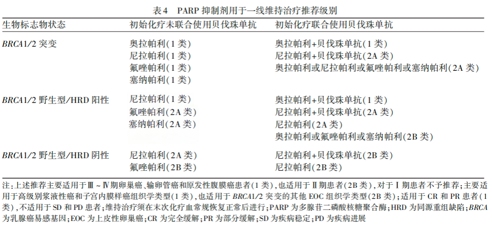 基于相关临床研究证据,推荐相应PARP抑制剂用于一线维持治疗(表4)。
