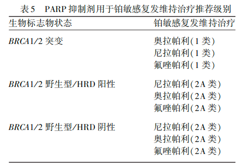 基于相关临床研究证据,本指南推荐相应PARP抑制剂用于铂敏感复发卵巢癌的维持治疗(表5)。