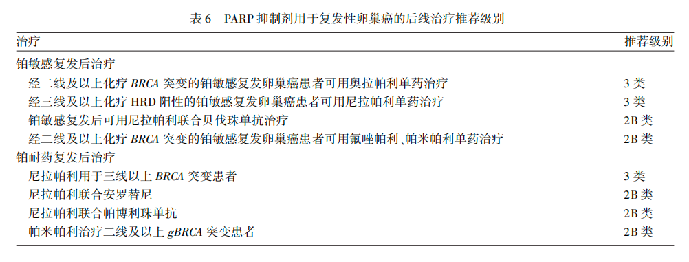 目前国内有PARP抑制剂(氟唑帕利、帕米帕利)获批用于复发性卵巢癌的治疗。基于相关临床研究证据,推荐相应PARP抑制剂用于复发性卵巢癌的后线治疗(表6)。