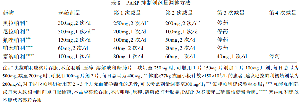 • 血红蛋白水平<80 g/L:暂停用药,必要时输血,恢复后减量使用 (常用PARP抑制剂的• 减量方法见表8,氟唑帕利待血红蛋白恢复至≥80 g/L后恢复用药,塞纳帕利待血红蛋白恢复至≥100g/L后恢复用药);